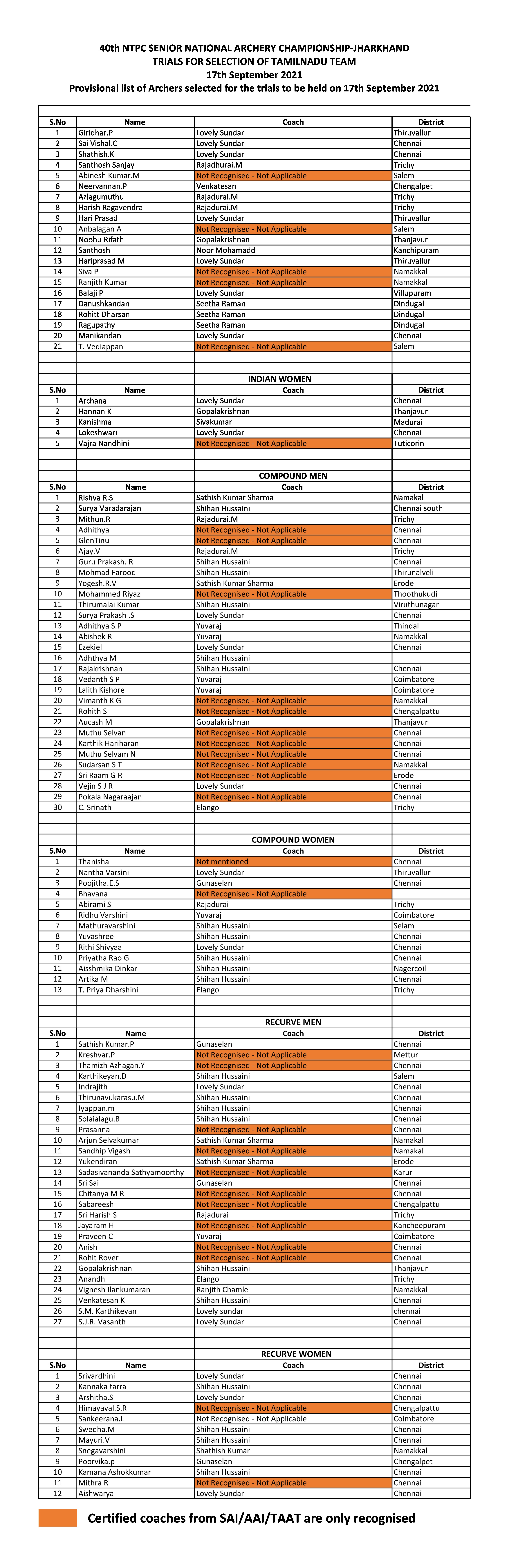 The following archers have been provisionally selected to participate in the trials to select the Tamilnadu team to represent in the 40th NTPC Senior Nationals in Jharkand subject to the following conditions:
